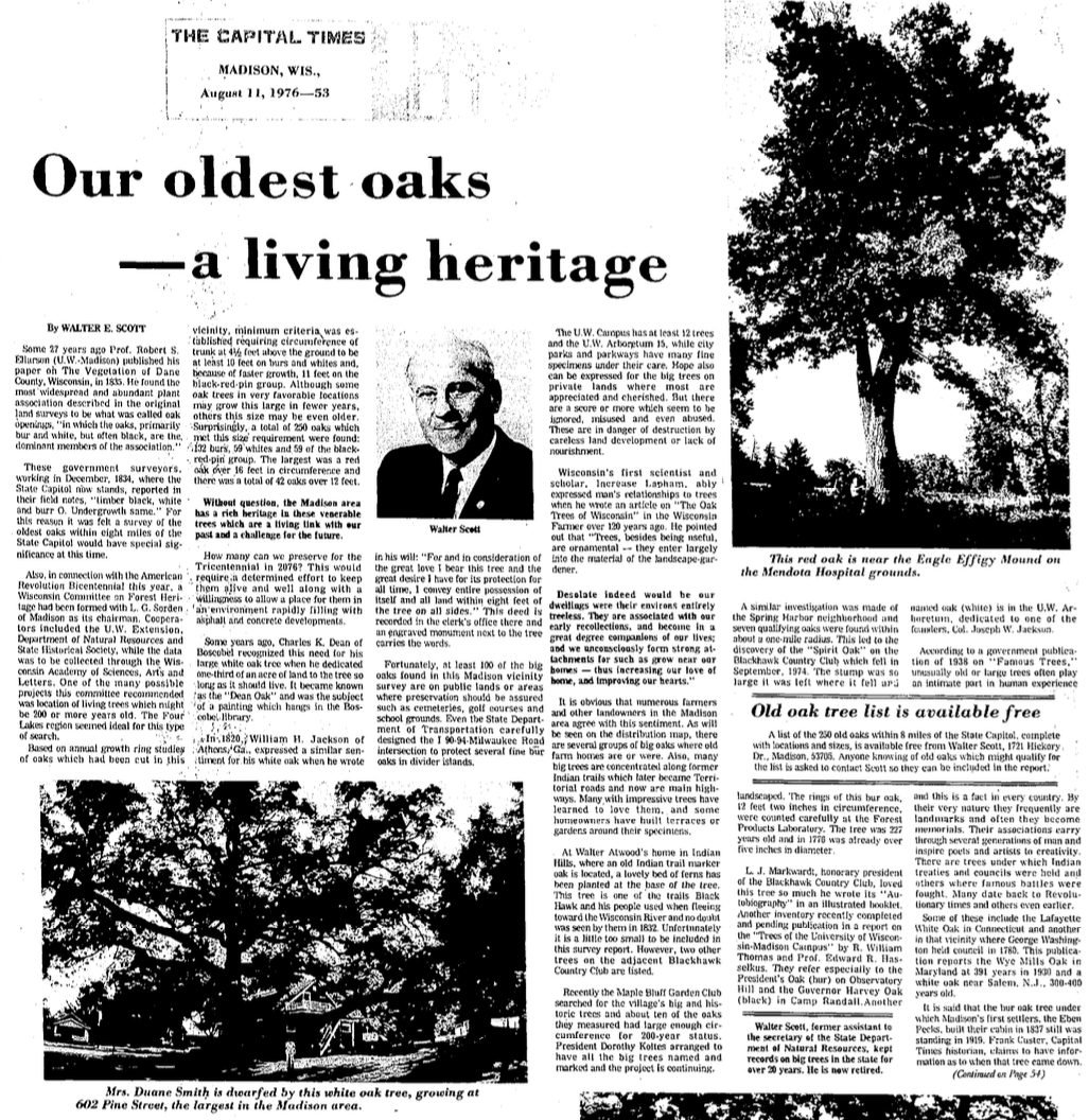 In 1976, Walter Scott, local conservationist, preservationist, writer and assistant to the Wisconsin DNR secretary, wrote in a Capital Times article that old oak trees “are a living link with our past and a challenge for the future.” Scott thereby initiated what is now called the Heritage Oak Project as a nod to both the previously dominant oak communities native to Dane County, and the U.S. Bicentennial of our country’s independence.