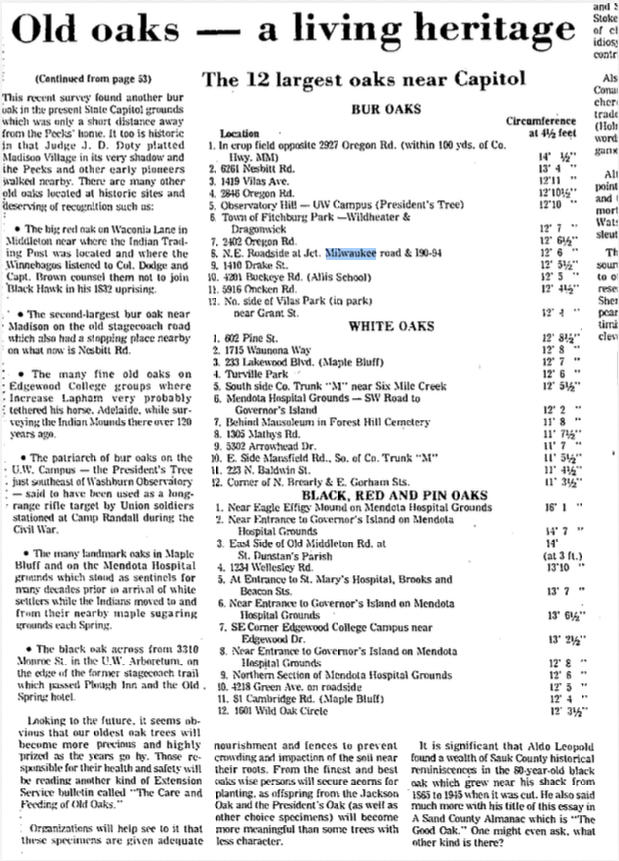 50 years since Walter Scott conducted his survey, and the Dane County Tree Board, the Capital Area Regional Planning Commission (CARPC) and the University of Wisconsin State Cartographer’s Office have completed a third round of inventorying what remains of the original list of oaks. These oaks are now at least 250 years old!
