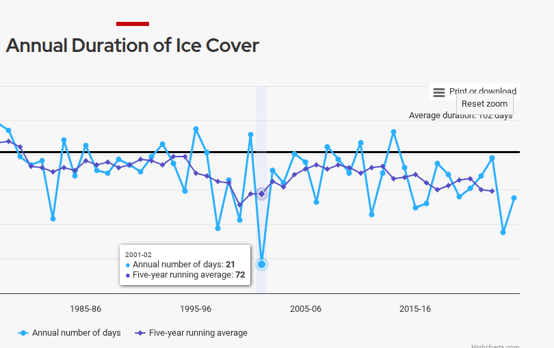 Have you ever heard the saying “Plant corn when oak leaves are the size of a squirrel’s ear” or “Plant potatoes when the first dandelions bloom”? If so, you’re familiar with a traditional, practical application of phenology. A wise gardener or farmer doesn’t toss heat-loving plant seeds into the ground on the first warm, sunny day. Weather doesn’t obediently follow the calendar; it’s unpredicatable, sometimes chaotic. One strategy is to just take the historical average. That’s better, but again, the fluctuations will deceive us. If you were planning to go ice fishing on Lake Mendota in the winter of 2001-02, it wasn’t much use to know that it was frozen for 115 days the previous winter, or an average of 72 days the previous five years. There were only 21 days with ice at all that winter!